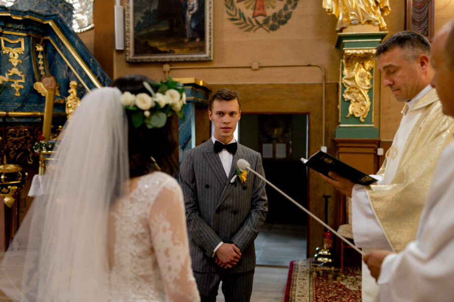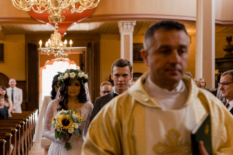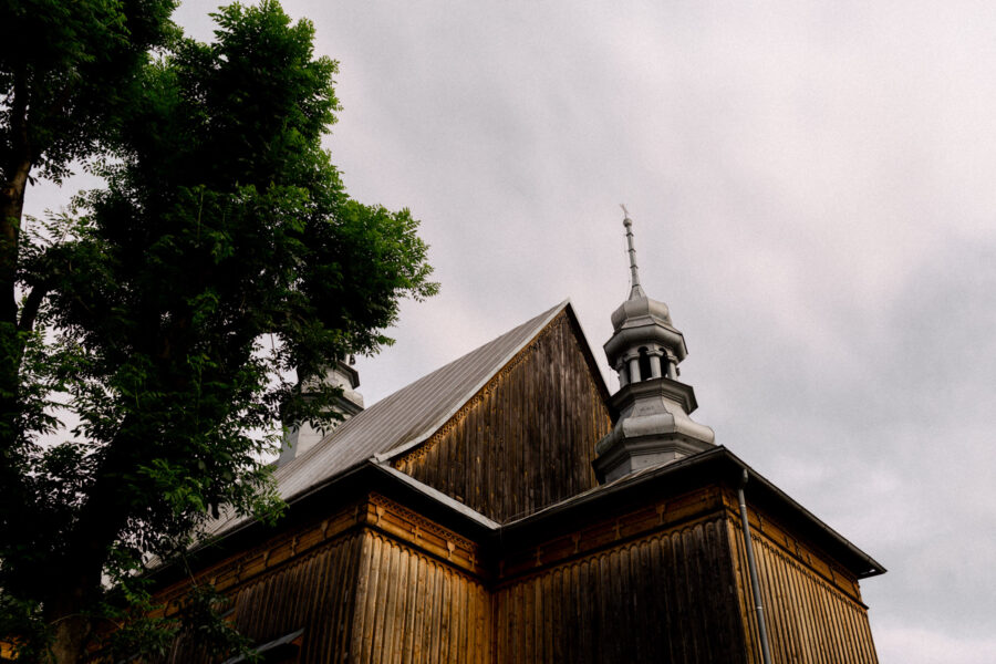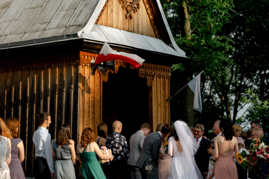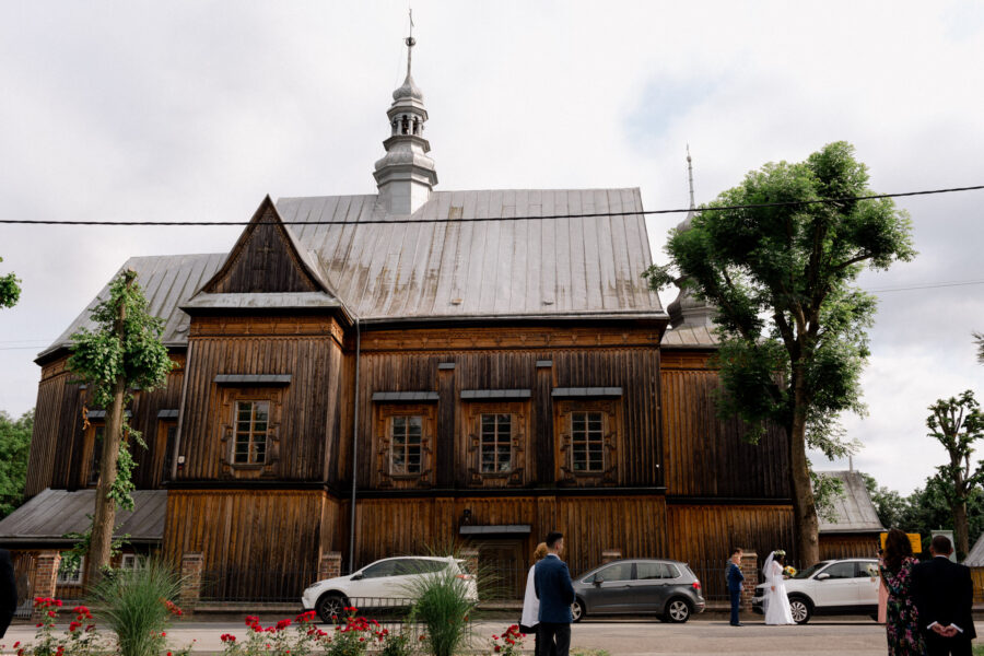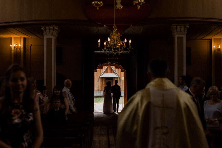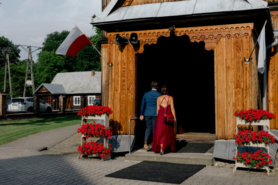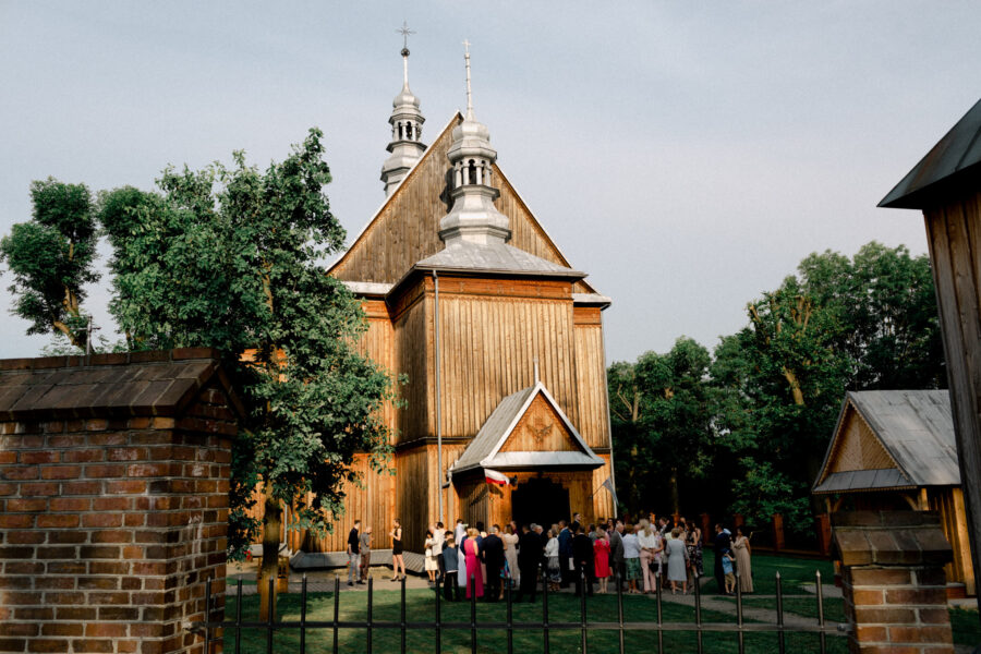 Ceremonia ślubna odbyła się w pięknym, drewnianym kościółku z XV wieku, w parafii Narodzenia Najświętszej Maryi Panny w Krzeszowie. To magiczne miejsce dodatkowo podkreśliło uroczystość tego dnia.