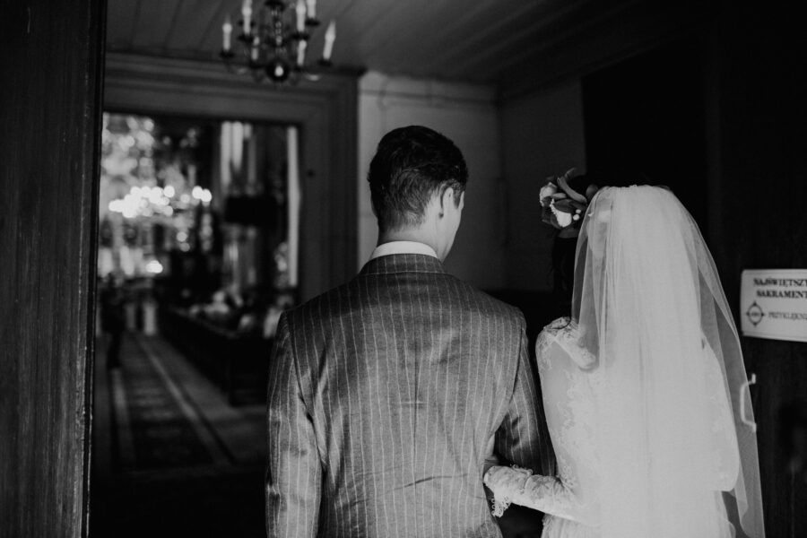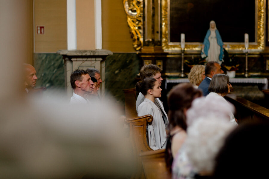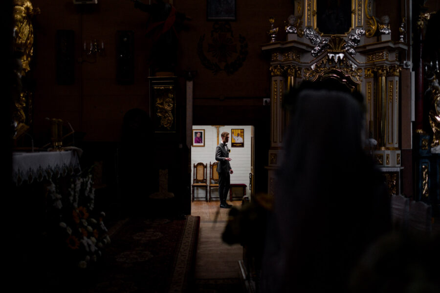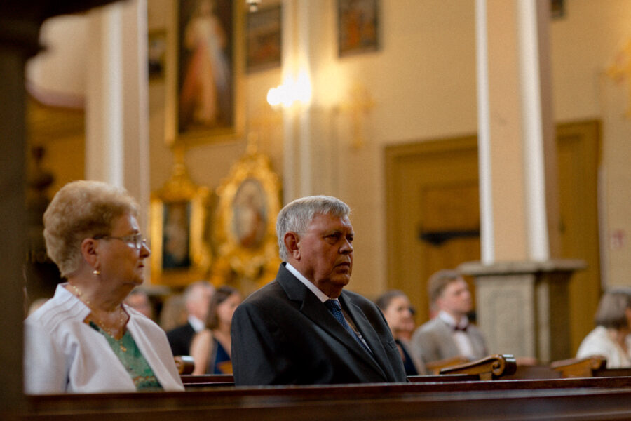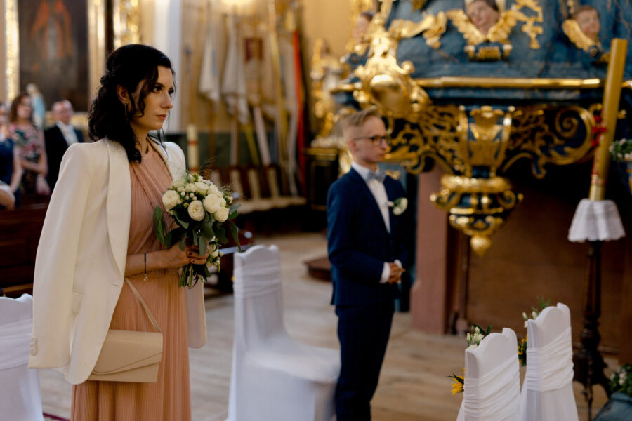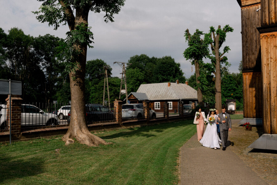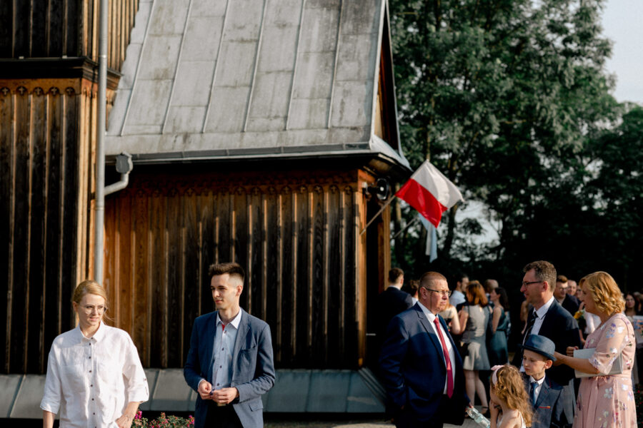 Ceremonia ślubna odbyła się w pięknym, drewnianym kościółku z XV wieku, w parafii Narodzenia Najświętszej Maryi Panny w Krzeszowie. To magiczne miejsce dodatkowo podkreśliło uroczystość tego dnia.