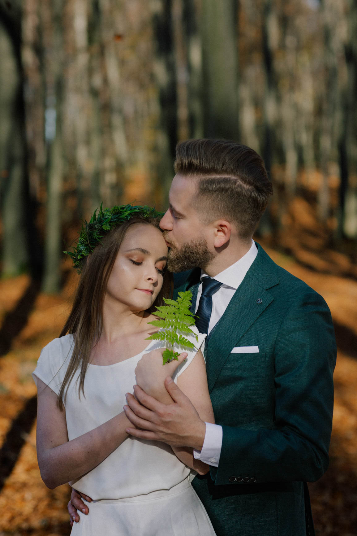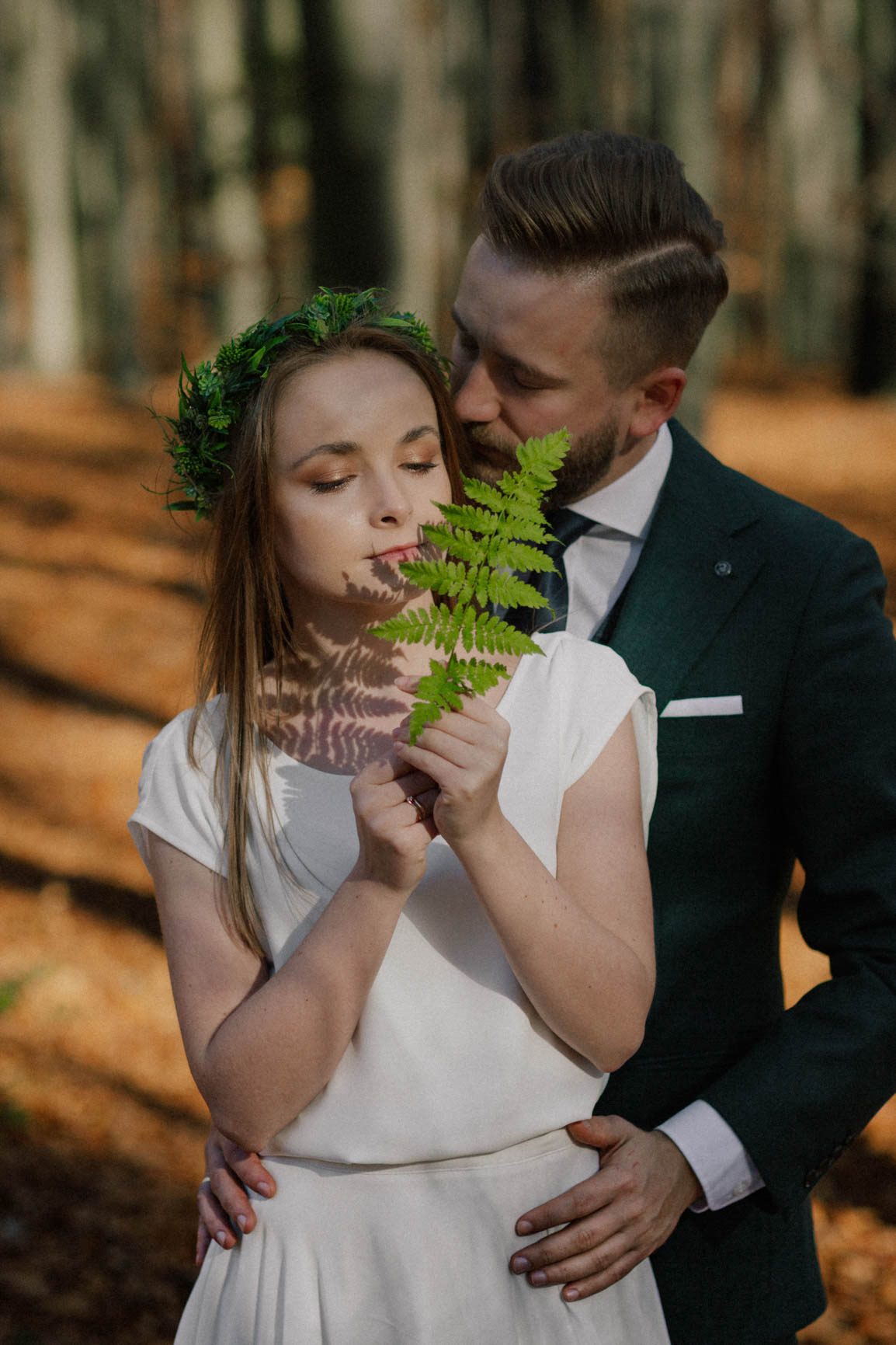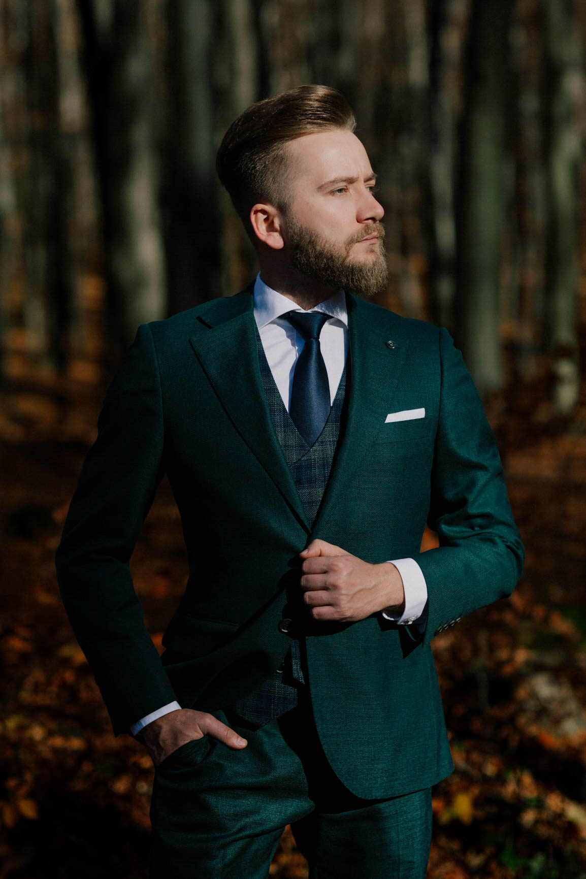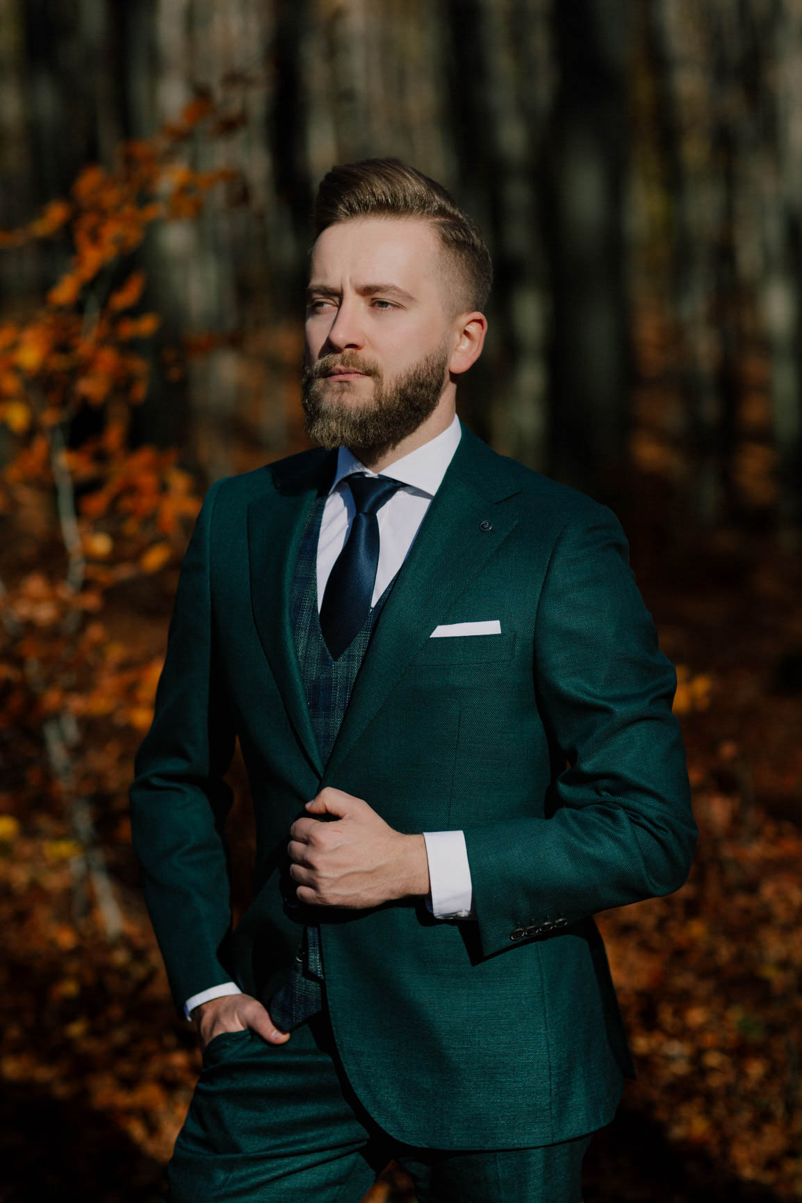 On – dżentelmen w każdym geście, w klasycznym garniturze o kolorze butelkowej zieleni, który doskonale współgrał z leśną scenerią.