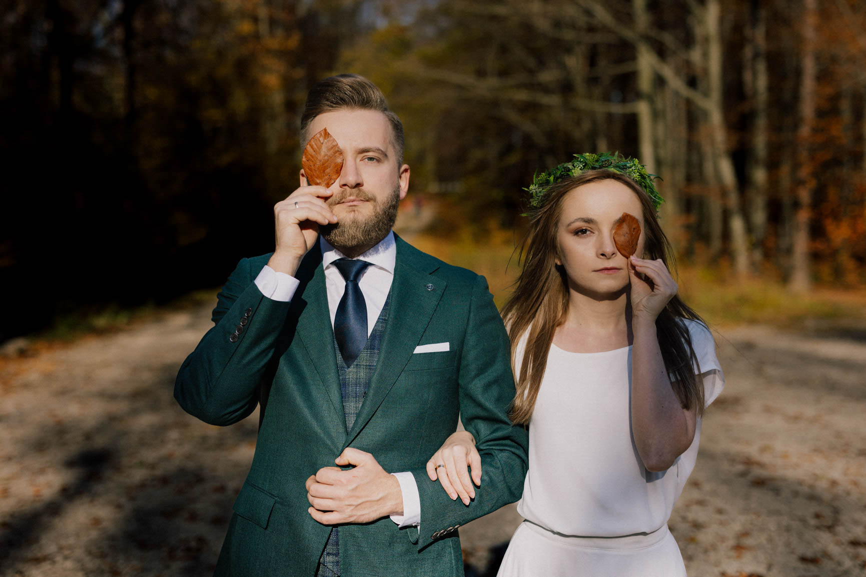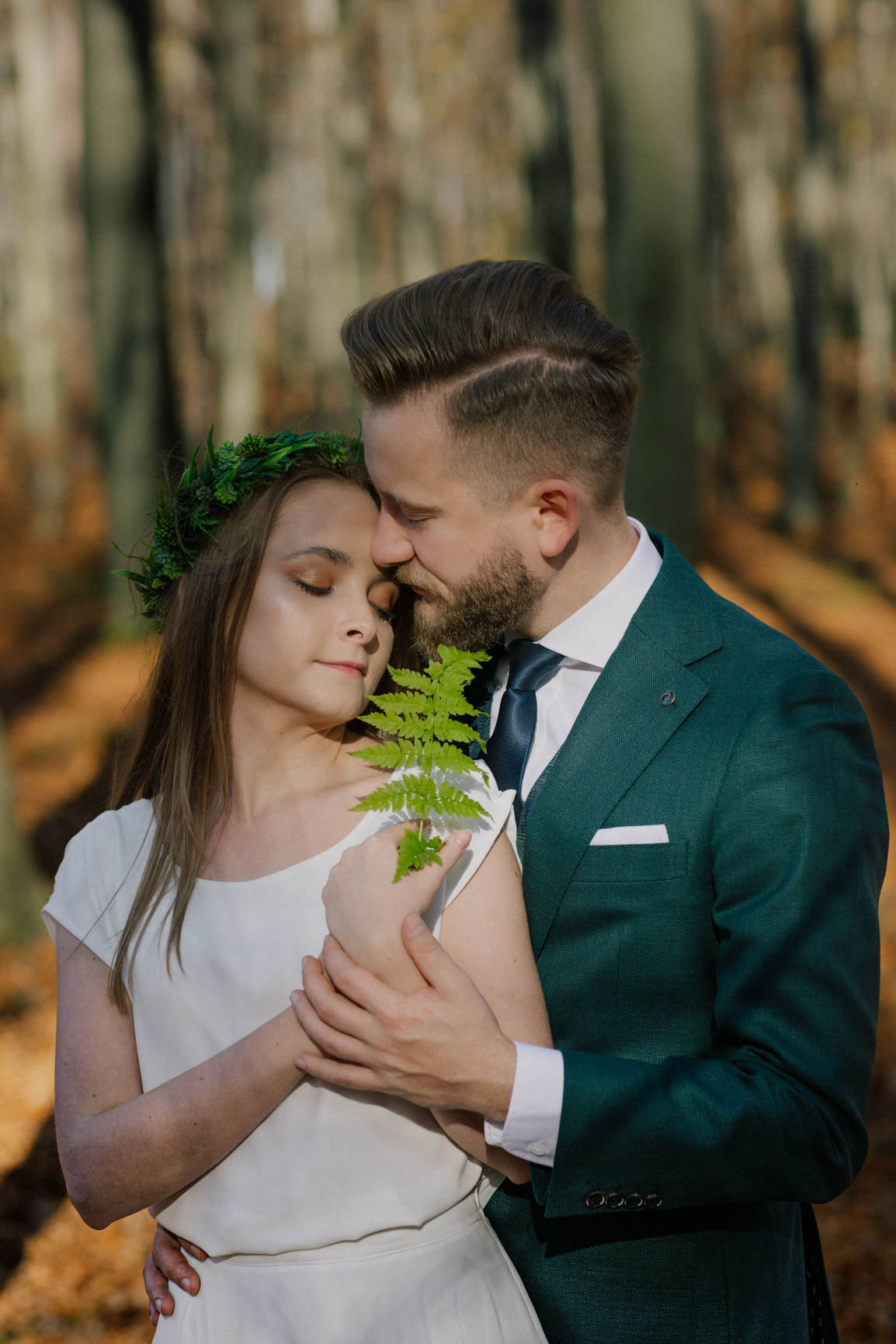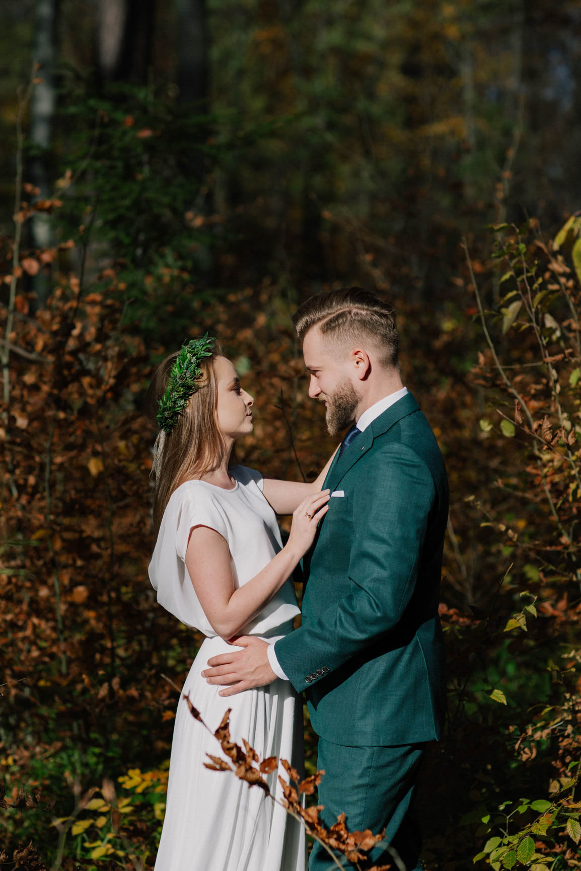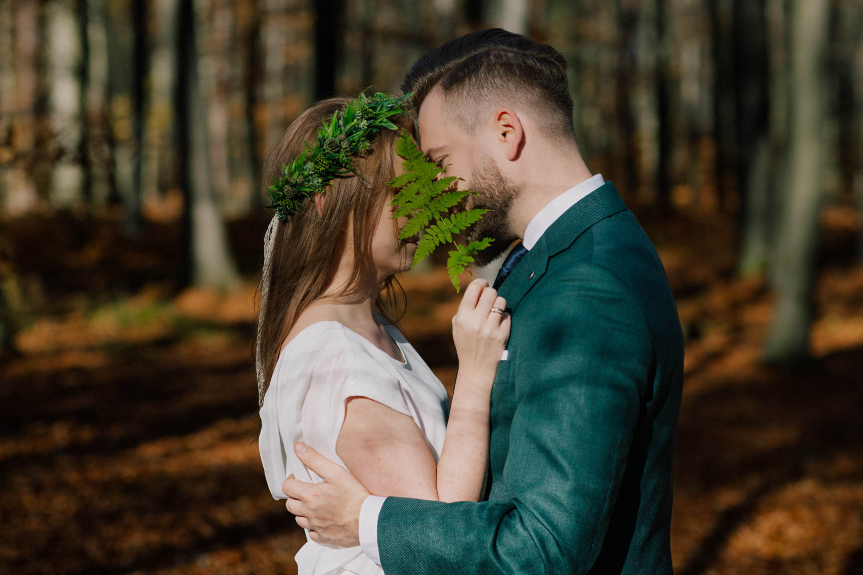 On – dżentelmen w każdym geście, w klasycznym garniturze o kolorze butelkowej zieleni, który doskonale współgrał z leśną scenerią.