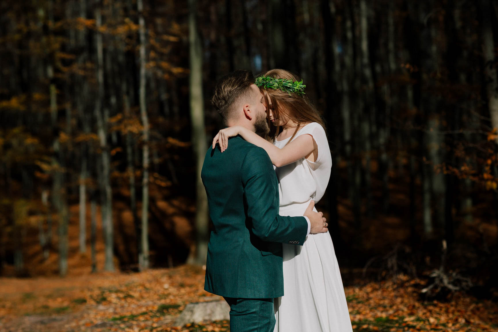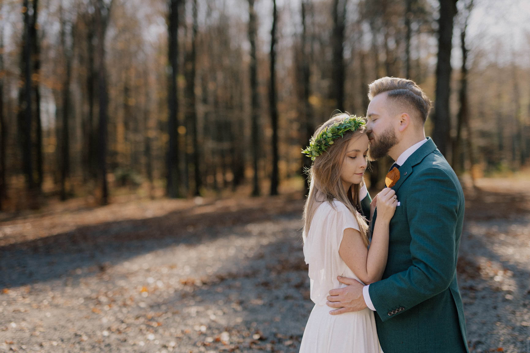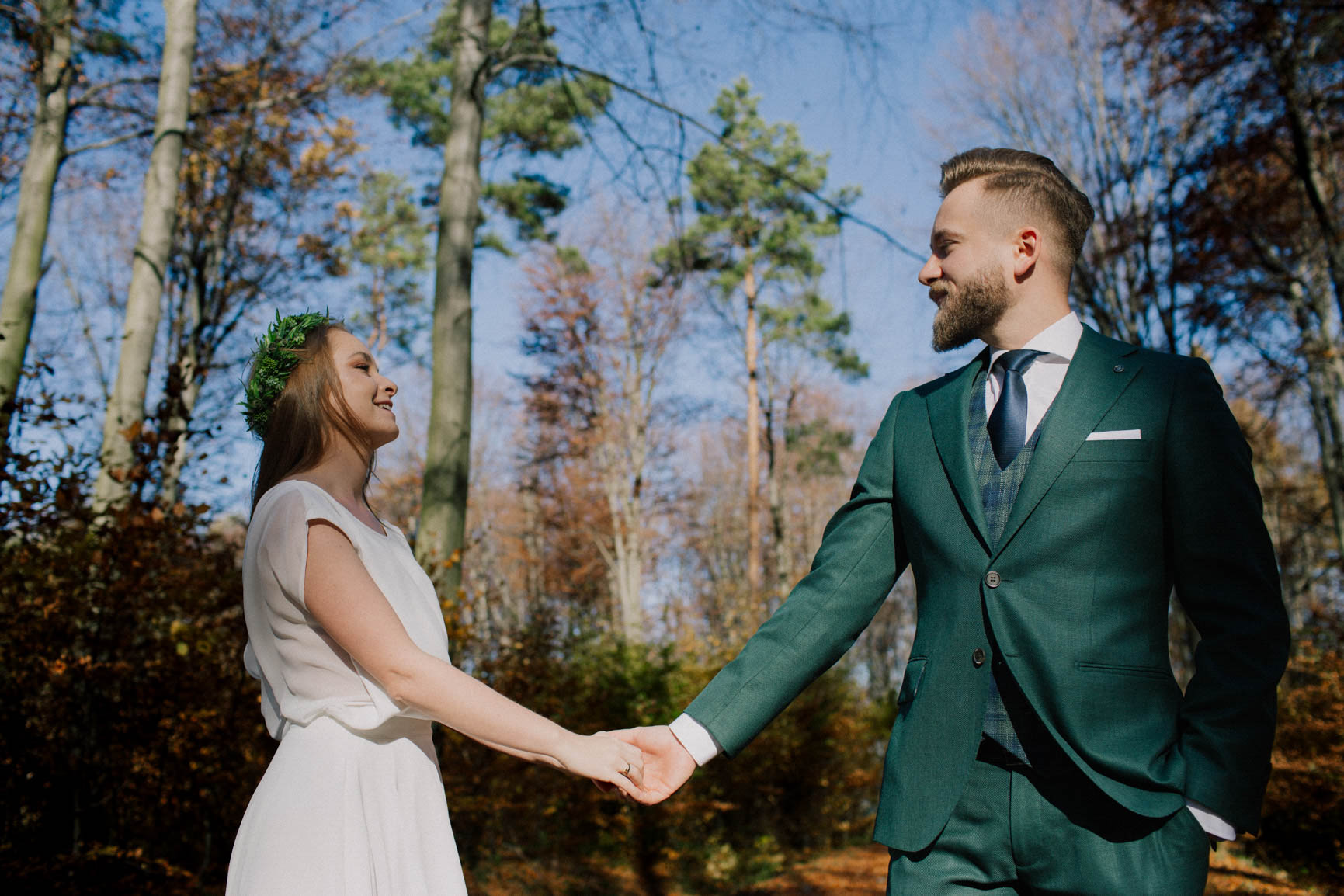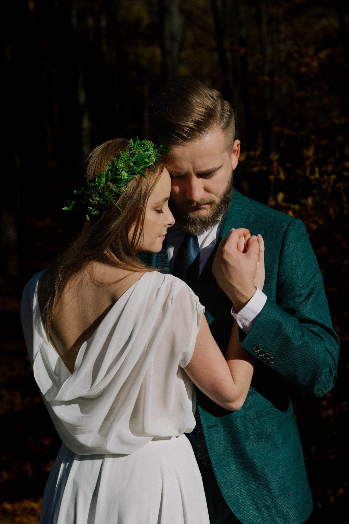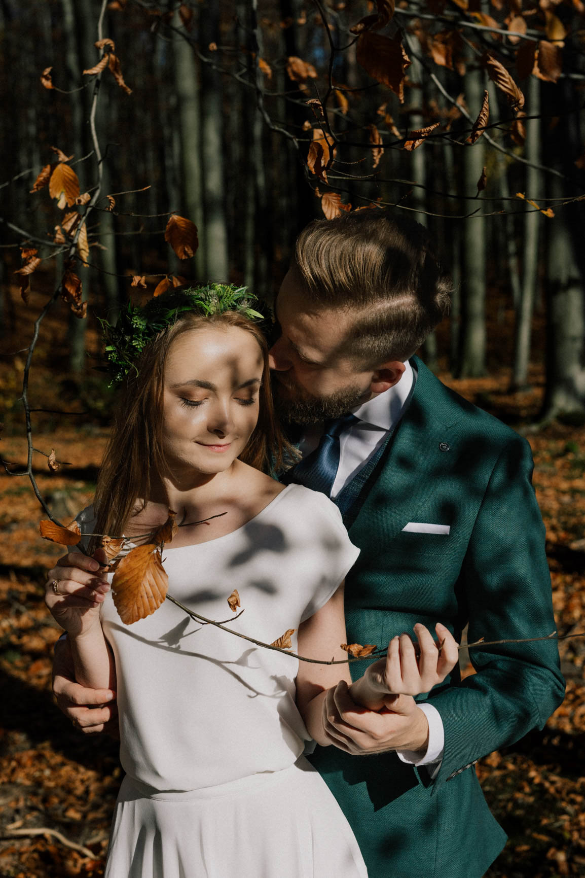 On – dżentelmen w każdym geście, w klasycznym garniturze o kolorze butelkowej zieleni, który doskonale współgrał z leśną scenerią.