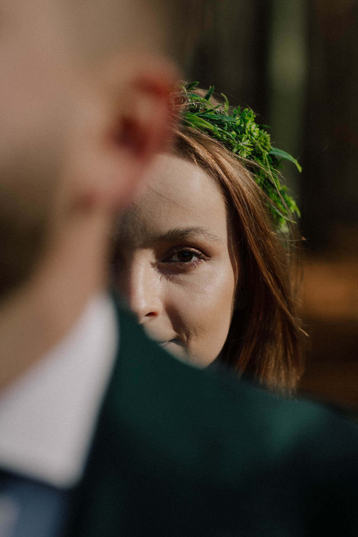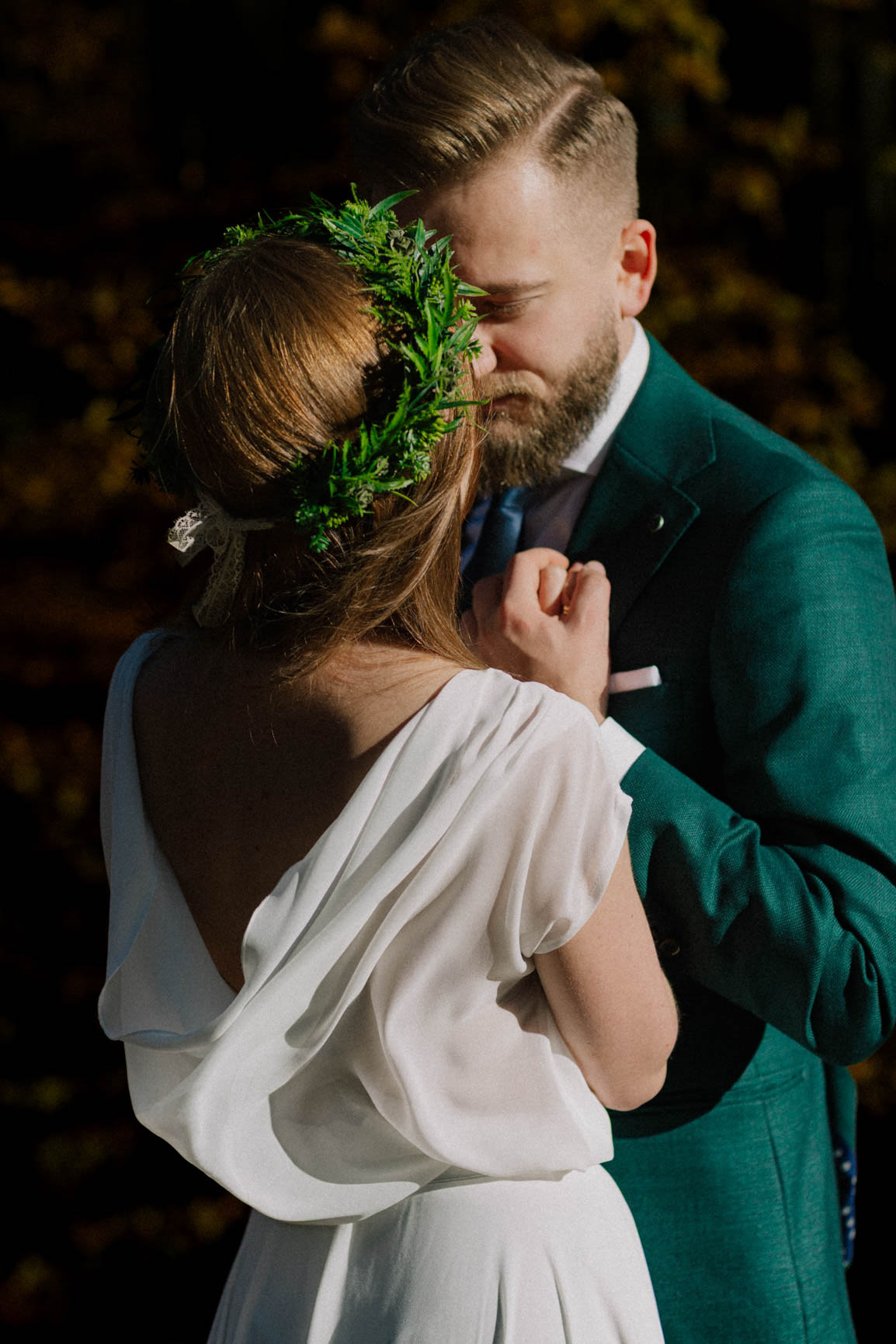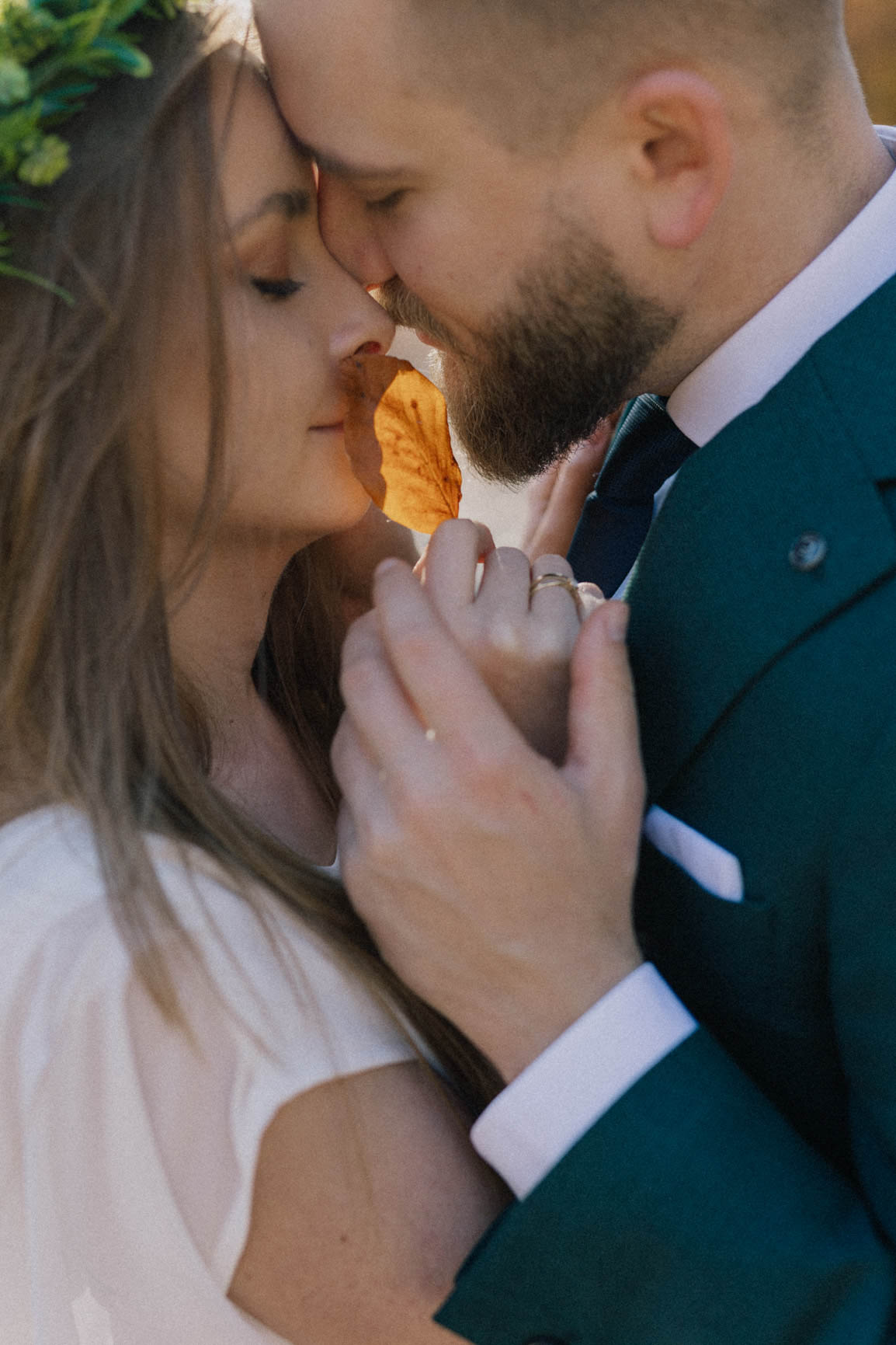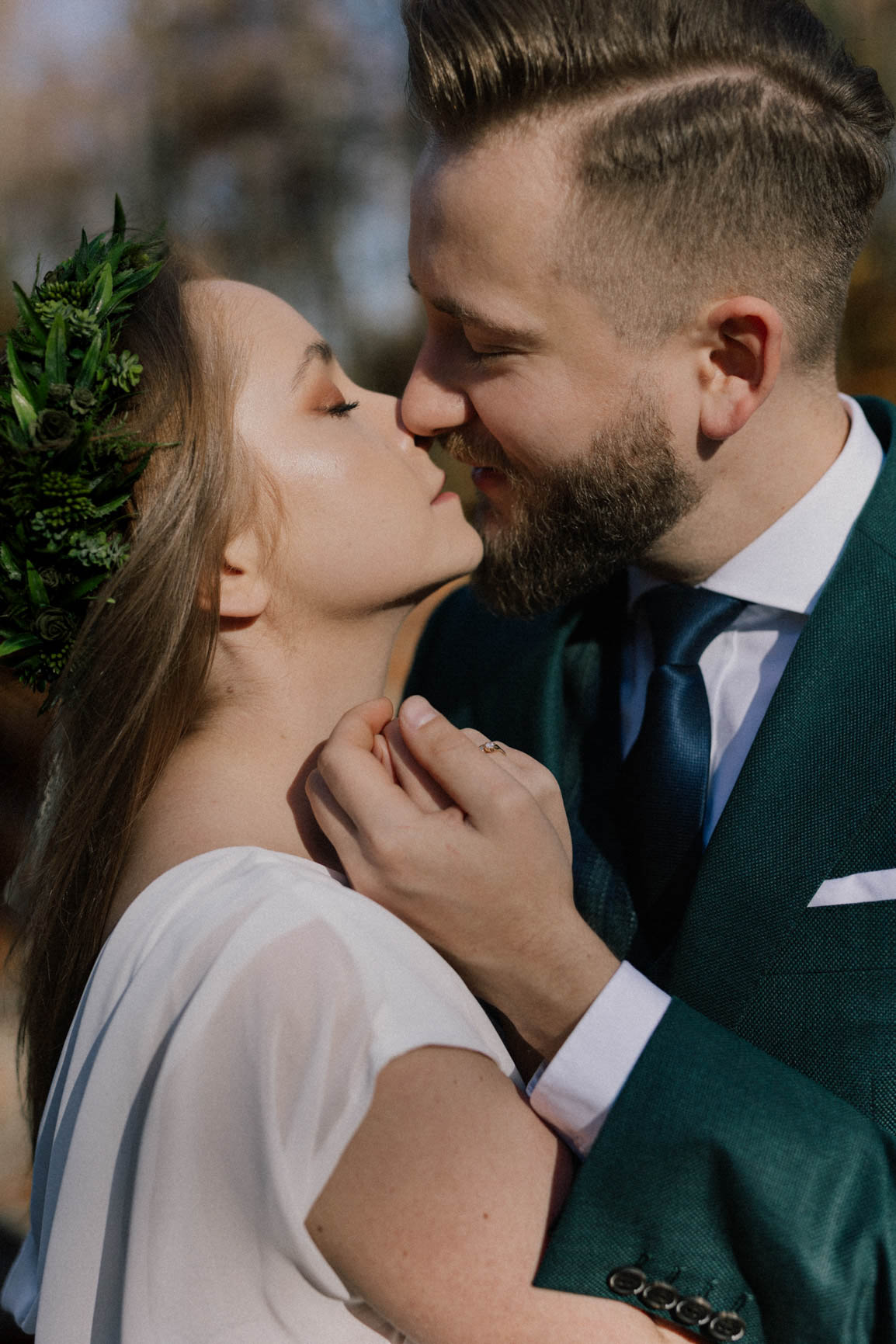 On – dżentelmen w każdym geście, w klasycznym garniturze o kolorze butelkowej zieleni, który doskonale współgrał z leśną scenerią.
