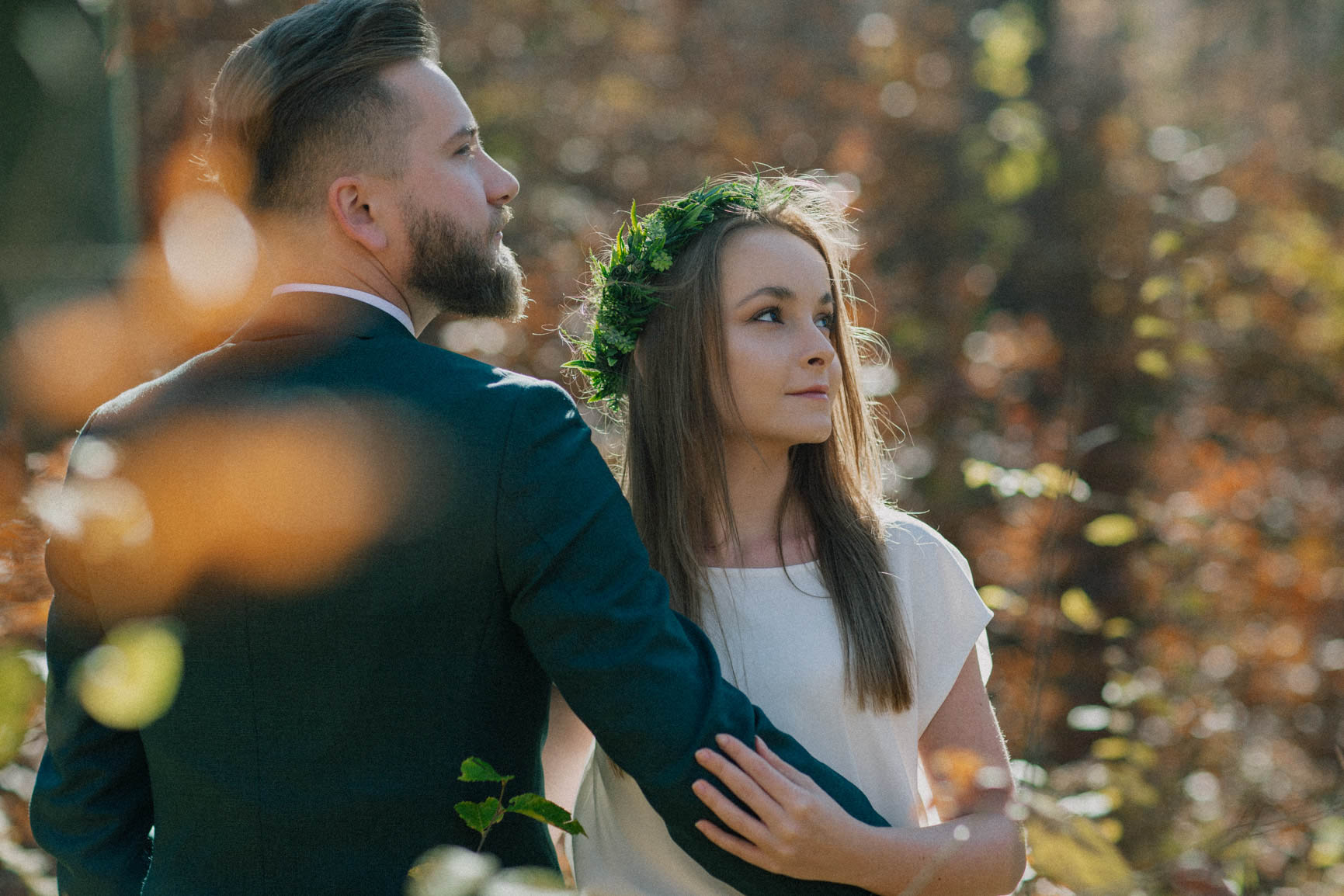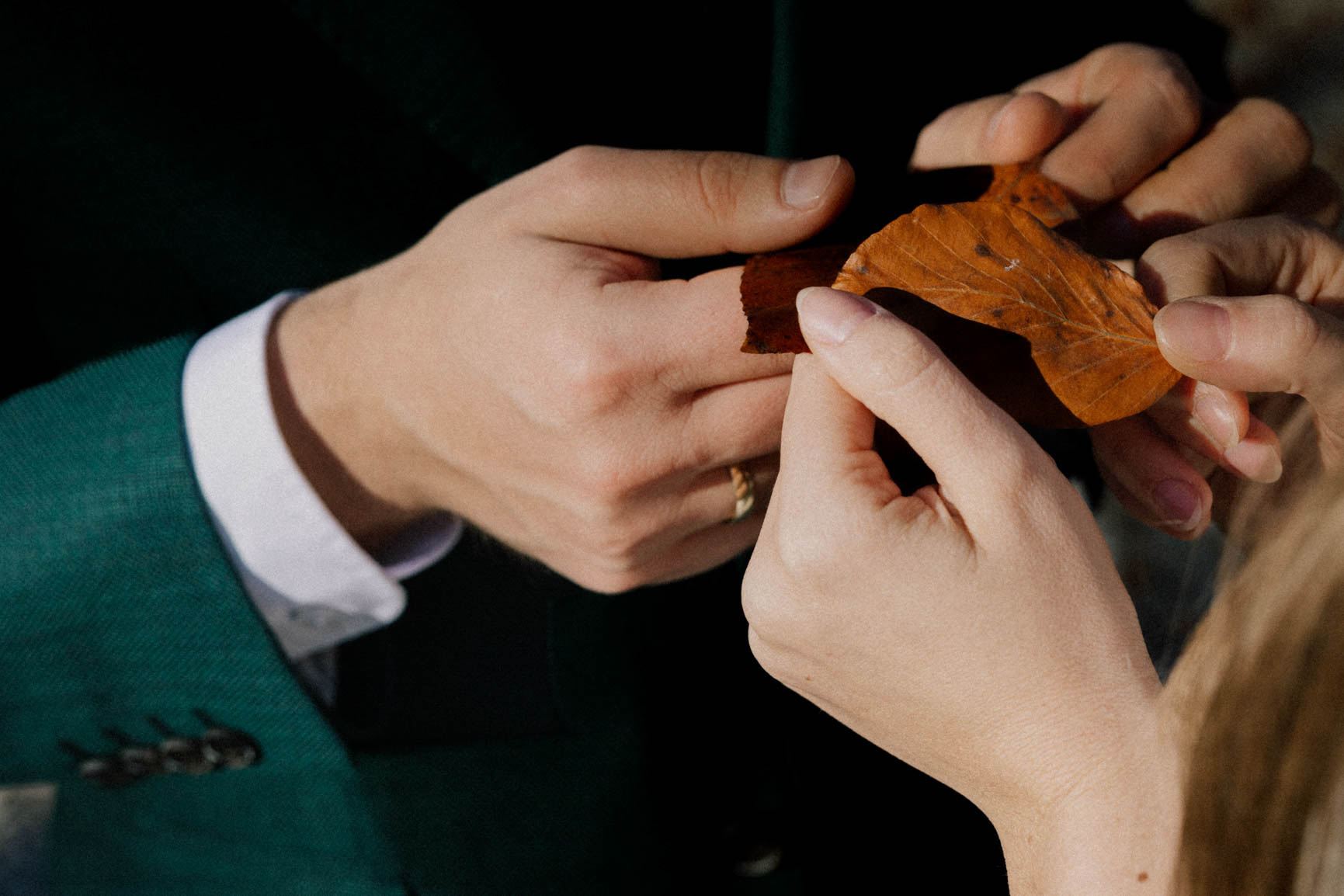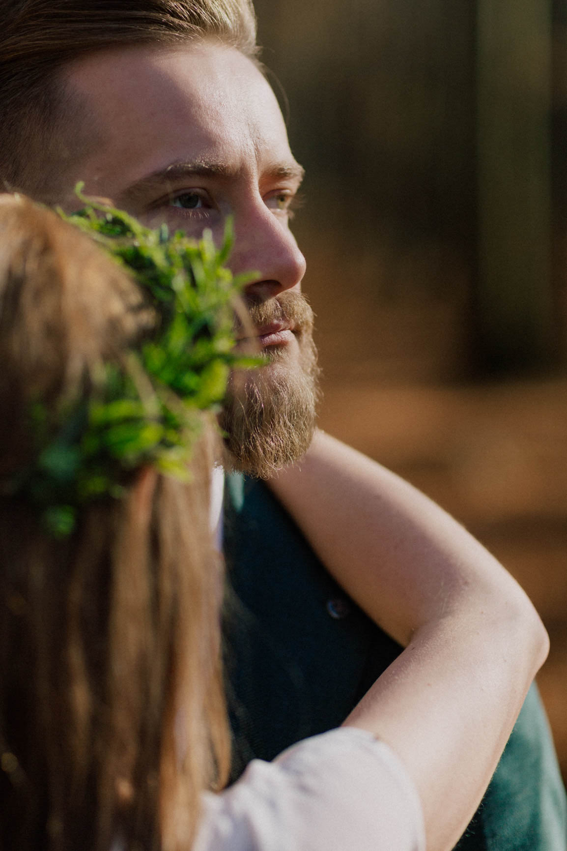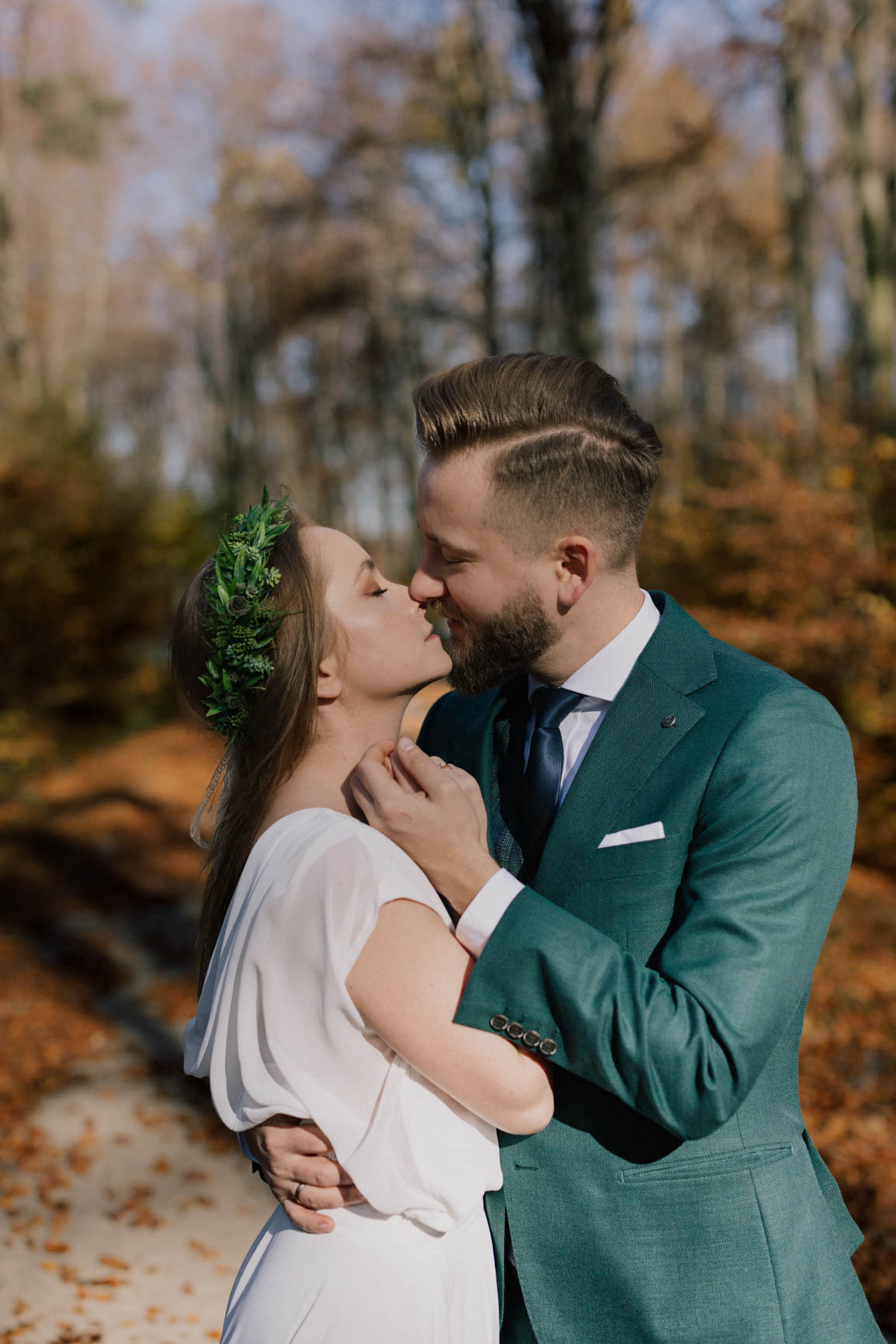 On – dżentelmen w każdym geście, w klasycznym garniturze o kolorze butelkowej zieleni, który doskonale współgrał z leśną scenerią.